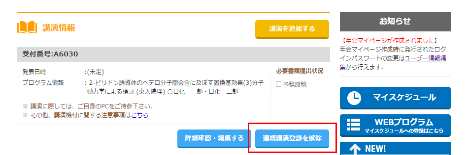 また、既に連続講演登録されている講演とは別の講演と連続講演を希望する場合や、連続講演を追加する場合は、一旦解除を行ってから再度連続講演登録を行って下さい。