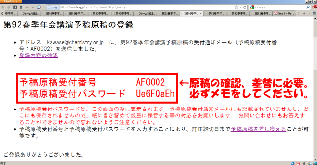- 正しく登録されれば、「予稿原稿受付番号」と「予稿原稿受付パスワード」が表示されます。予稿原稿受付パスワードは、この画面のみに表示されます。 登録完了時に送信される予稿原稿受理通知メールにも記載されていませんし、どこにも保存されませんので、紙に書き留めて厳重に保管する等の対応をお願いします。