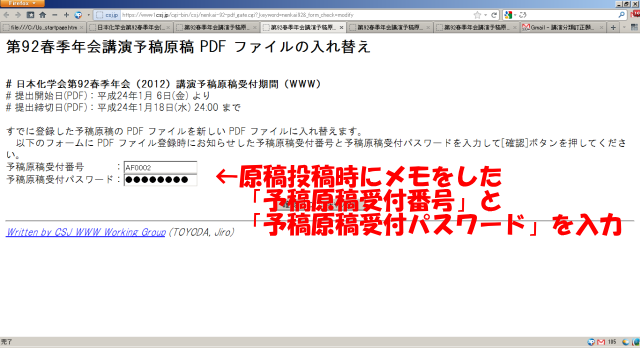 第92春季年会(2012) 講演予稿原稿の PDF ファイルを新規にアップロードする。」を選択し、「OK」をクリックします。