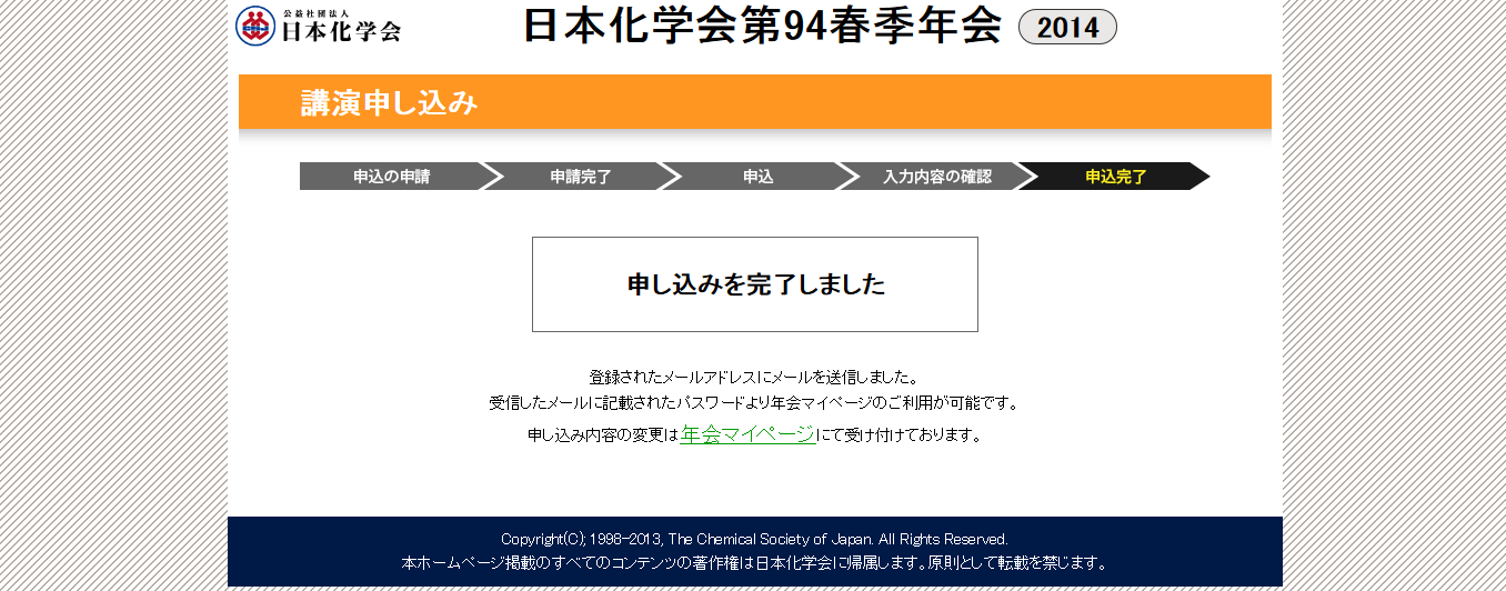 連続講演の登録はこの時点では完了していません。全ての連続する講演の申込が完了した後に、年会マイページ上より連続講演登録を行って下さい。詳細はこちらをご覧ください。 |
