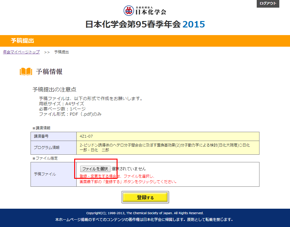 予稿原稿を差し替える場合は、以下の手順に沿ってファイルを選択し登録して下さい。